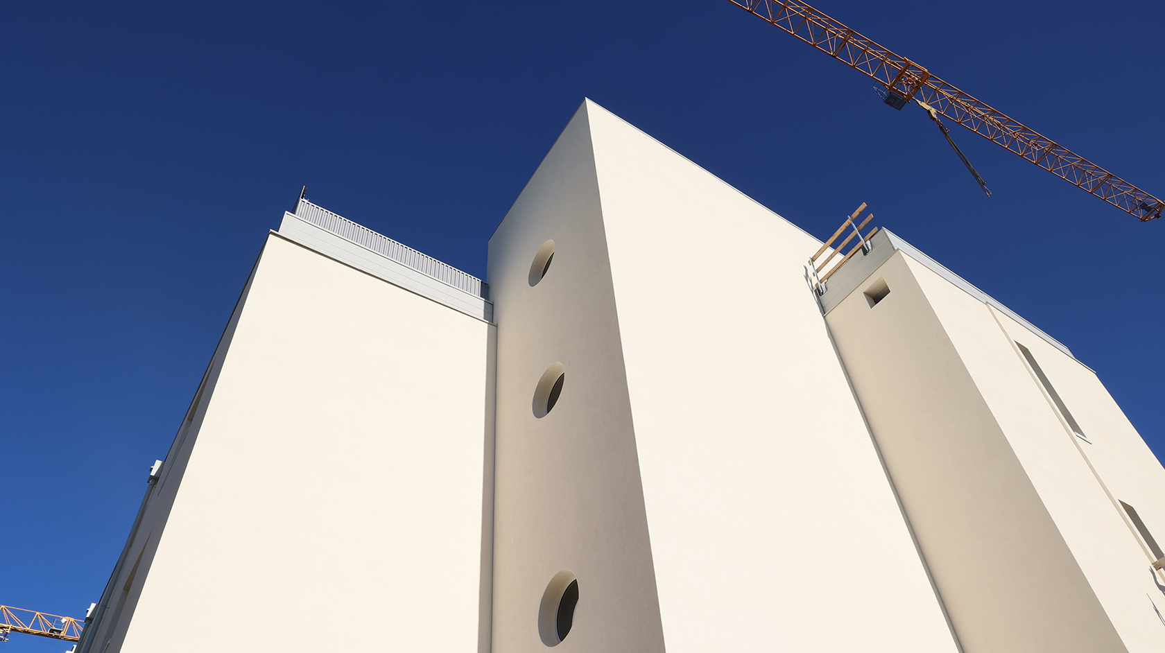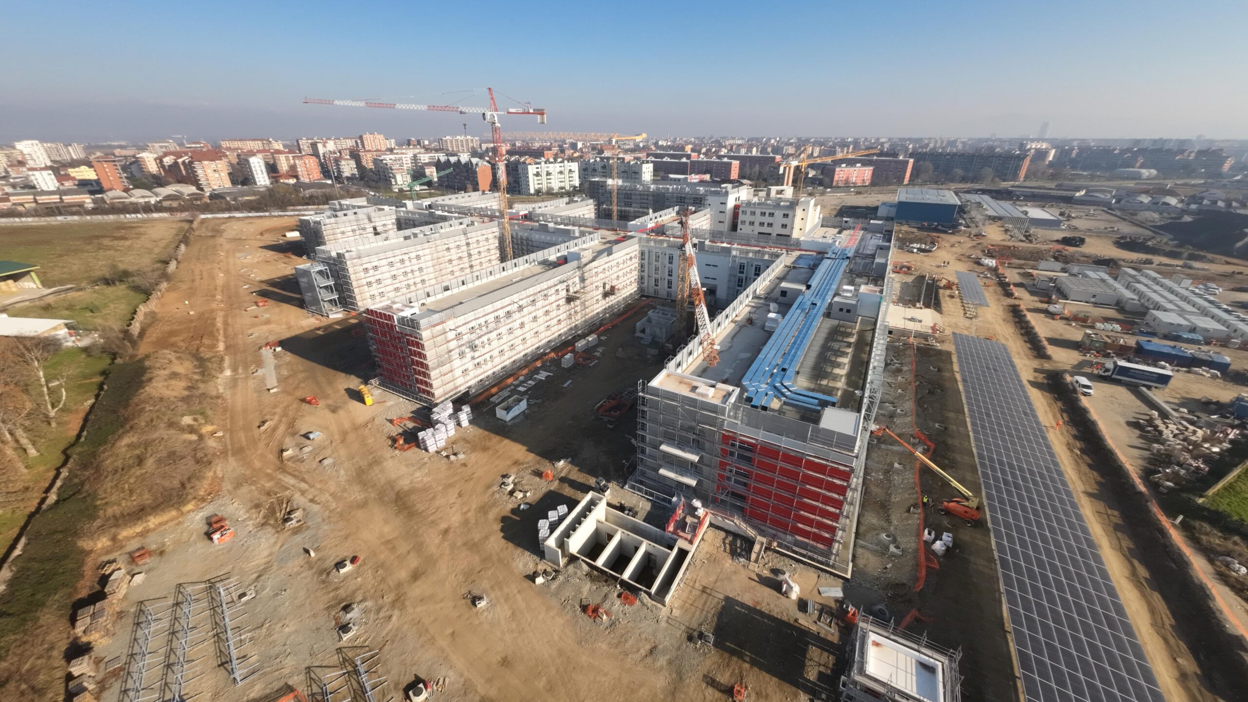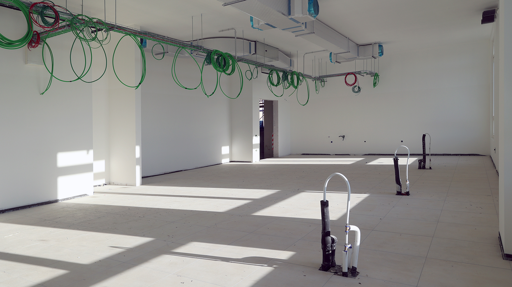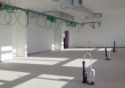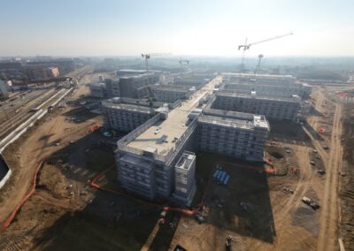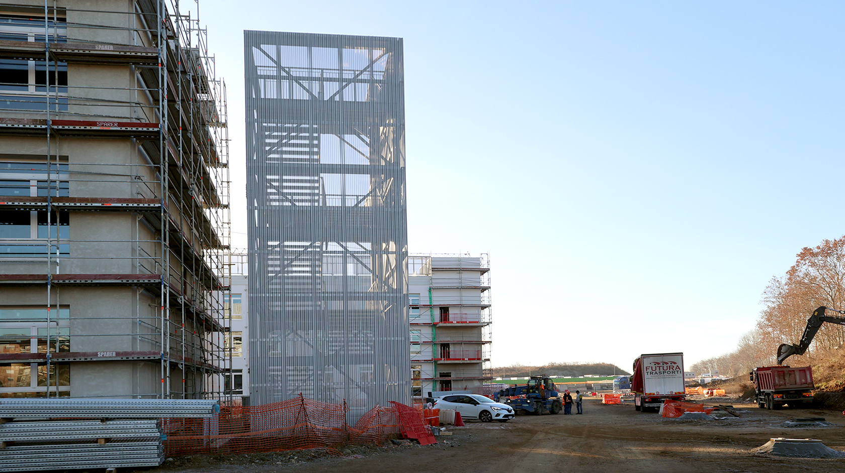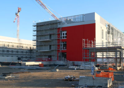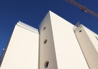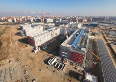Edificio DA: sono iniziate le tinteggiature eterne, sono in fase di sviluppo i lavori impiantistici meccanici ed elettrici a tutti i piani, sono in fase di realizzazione i pavimenti.