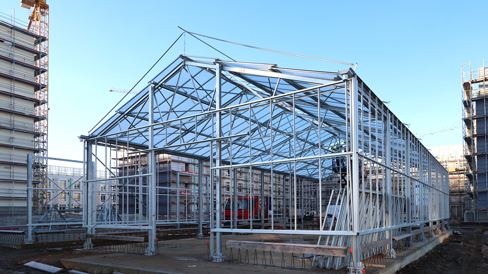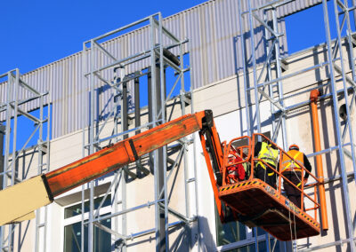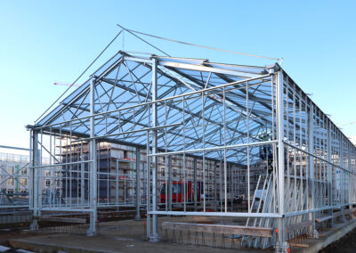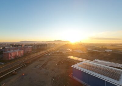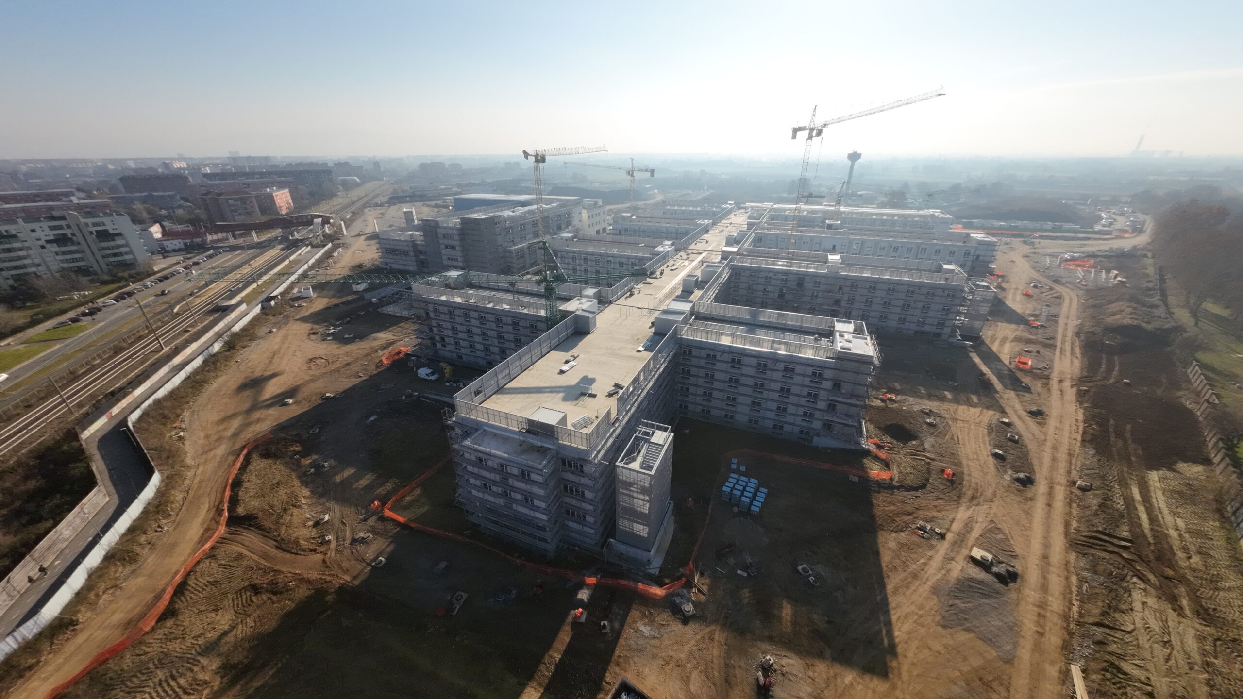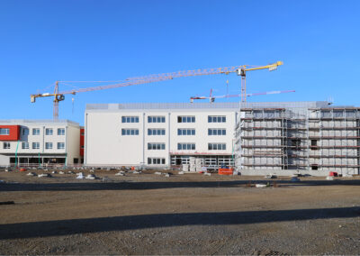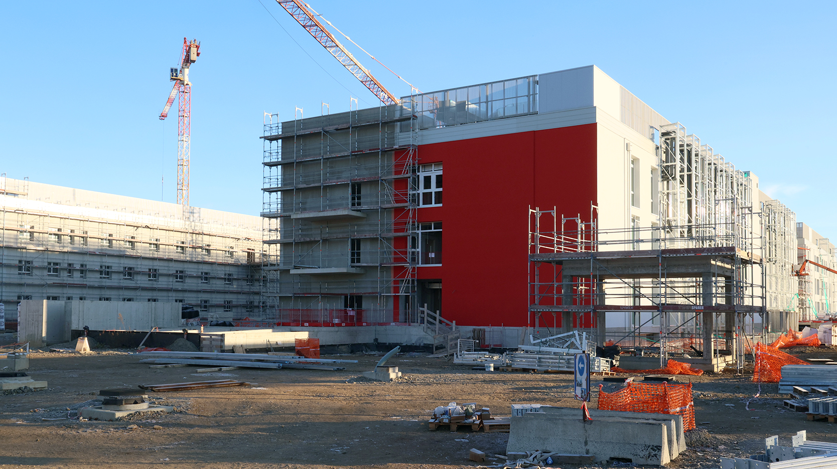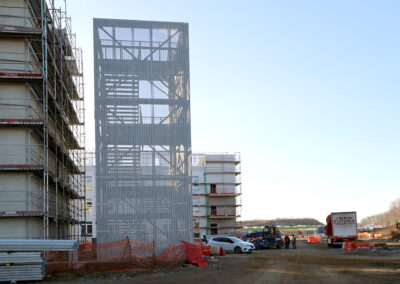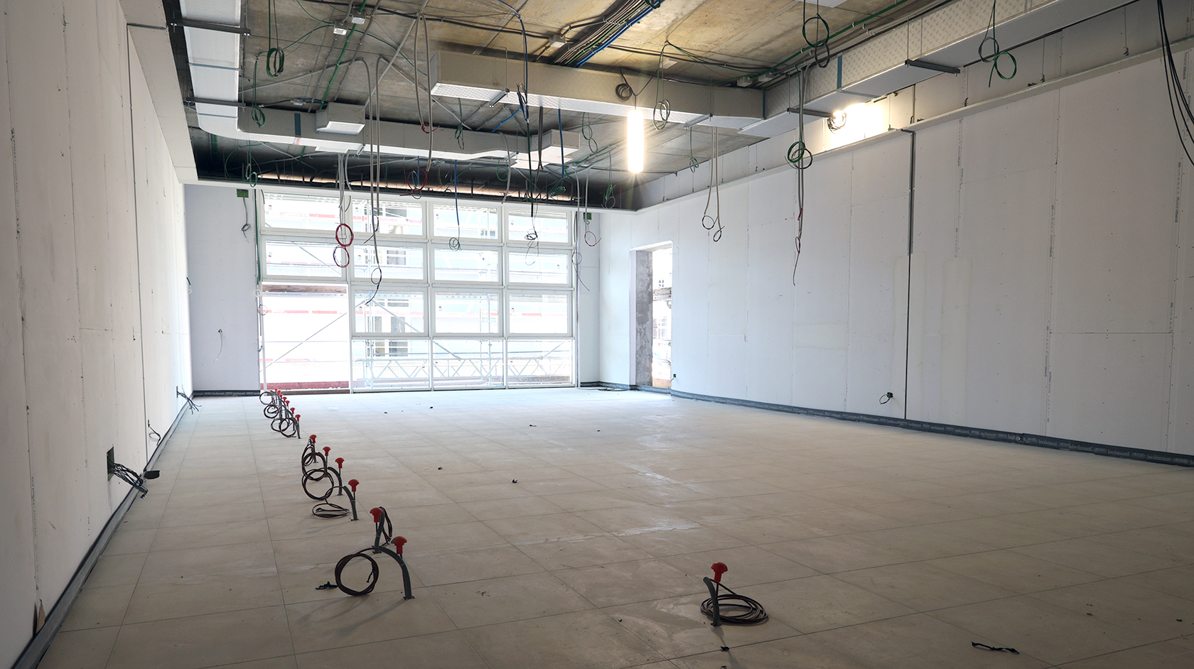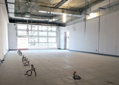 Edificio DA: sono iniziate le tinteggiature eterne, sono in fase di sviluppo i lavori impiantistici meccanici ed elettrici a tutti i piani, sono in fase di realizzazione i pavimenti.