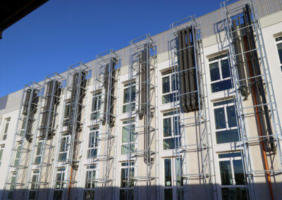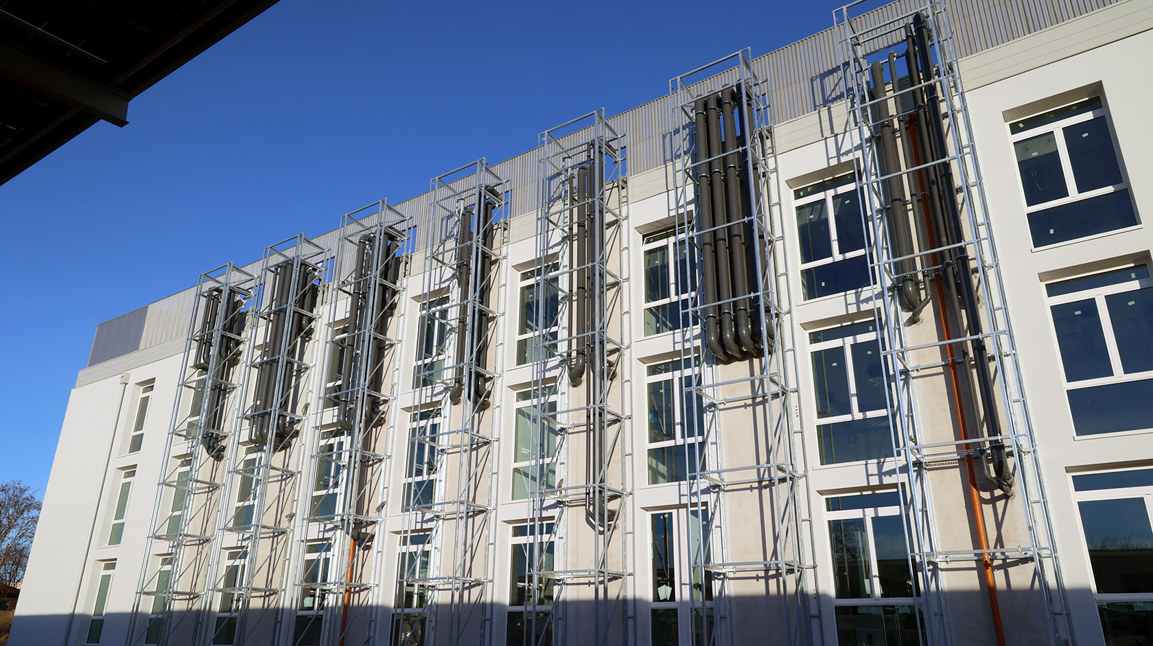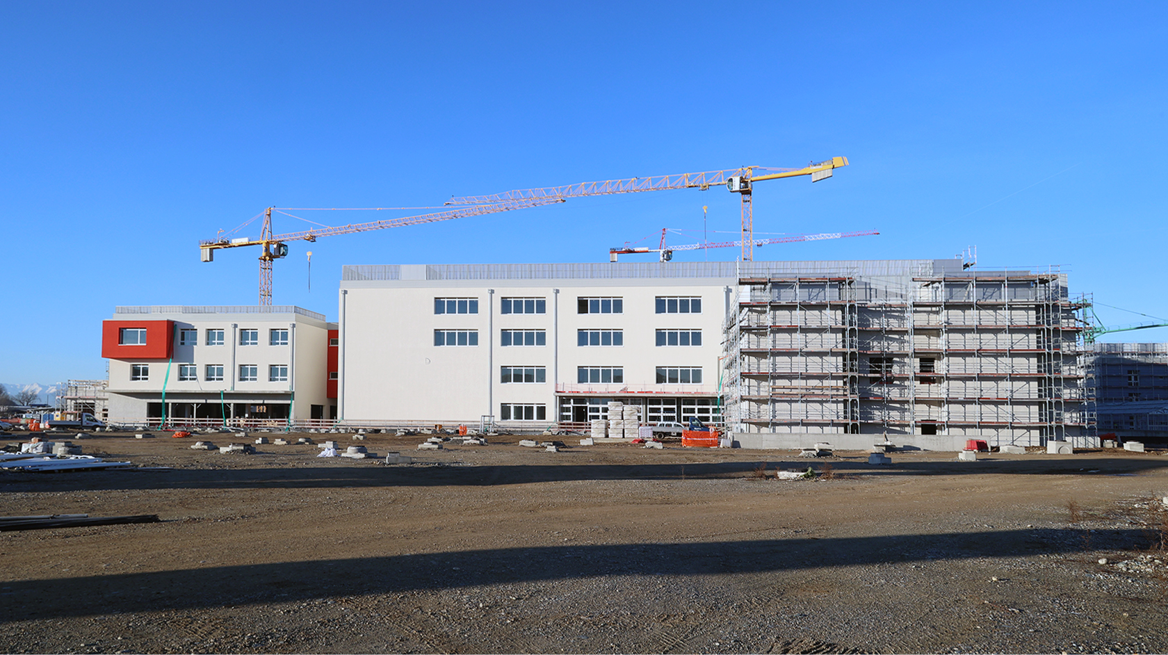 Edificio DR: sono iniziate le tinteggiature esterne, sono in fase di sviluppo i lavori impiantistici meccanici ed elettrici a tutti i piani, sono in fase di realizzazione i pavimenti e sono iniziati i montaggi degli arredi tecnici dei laboratori.