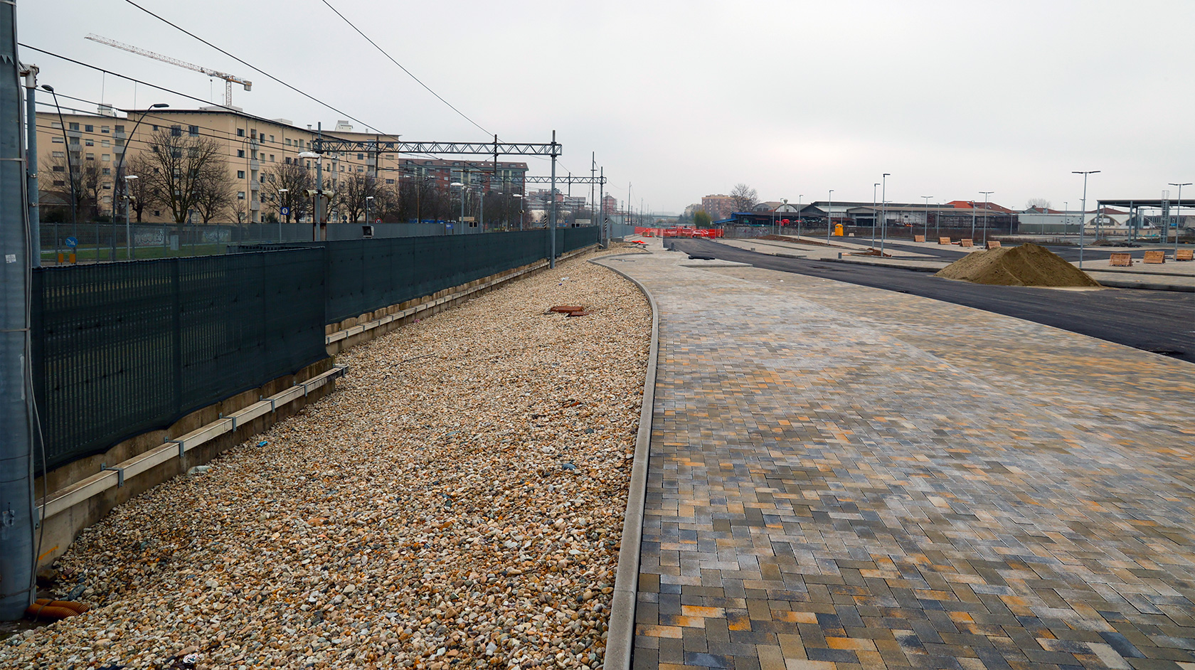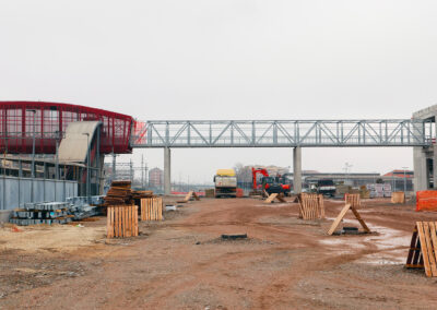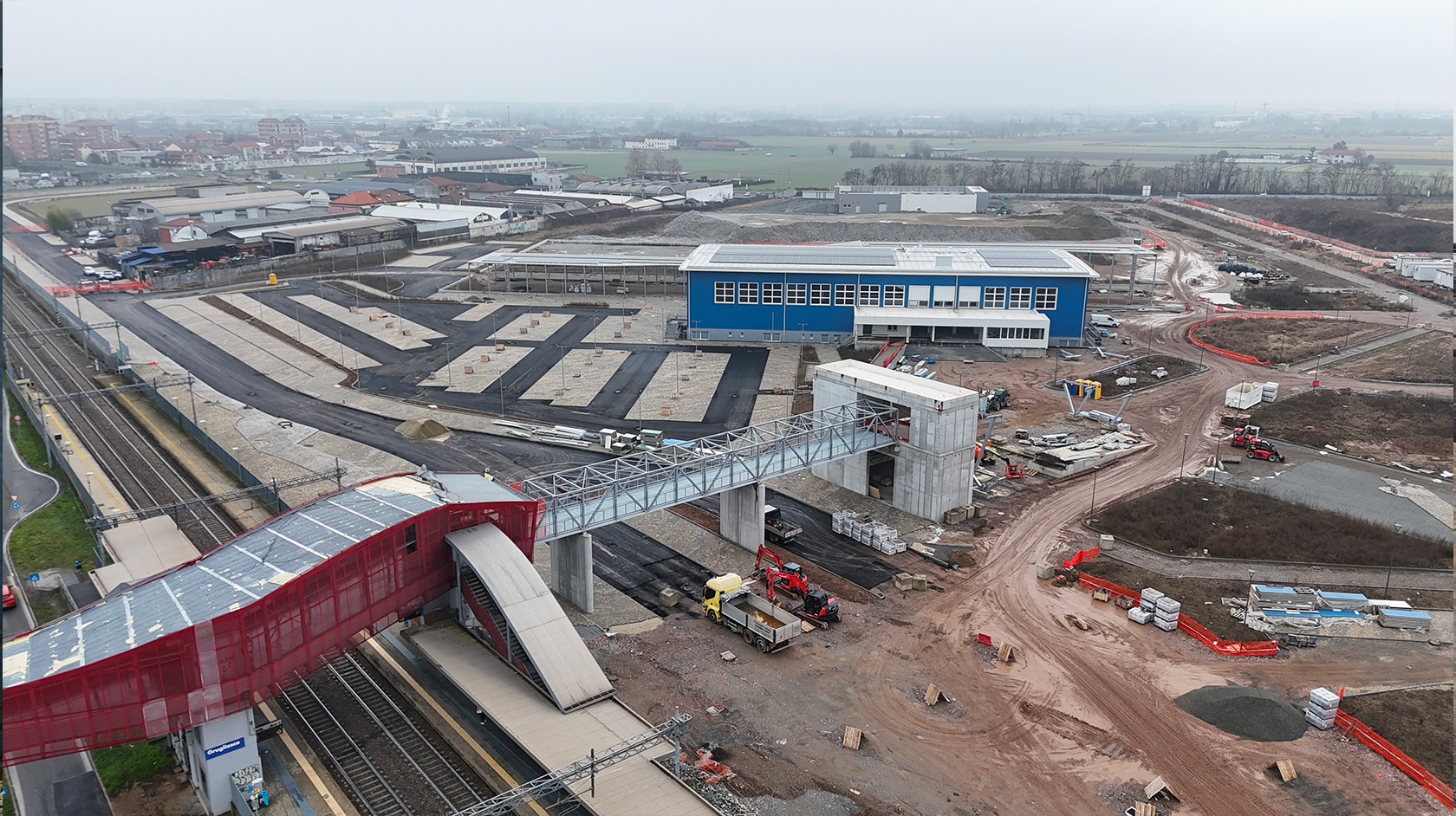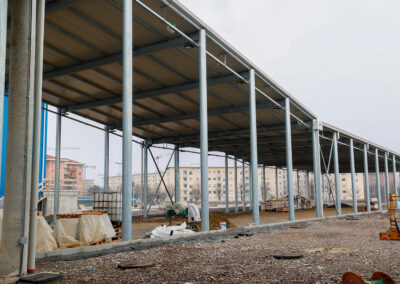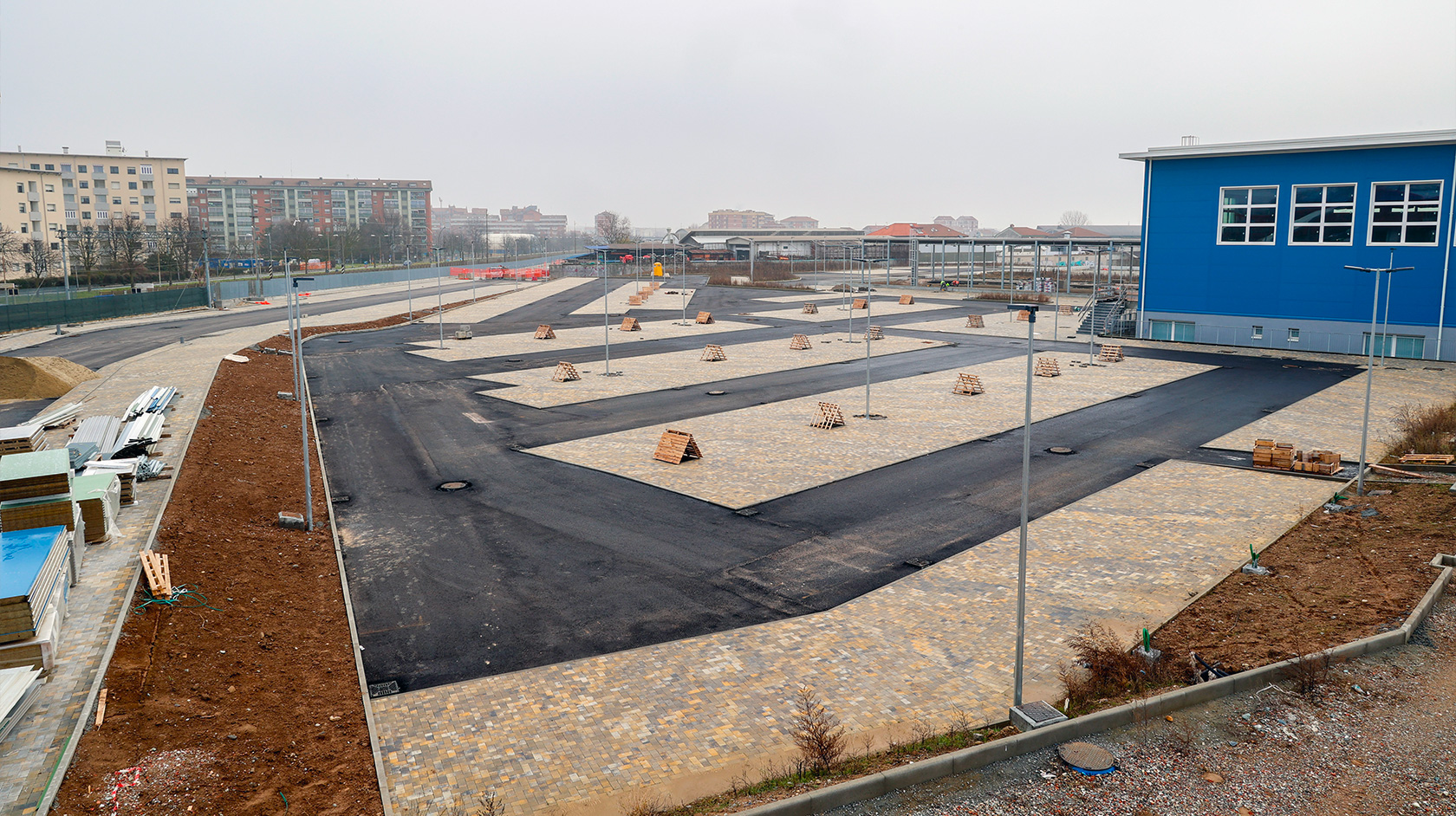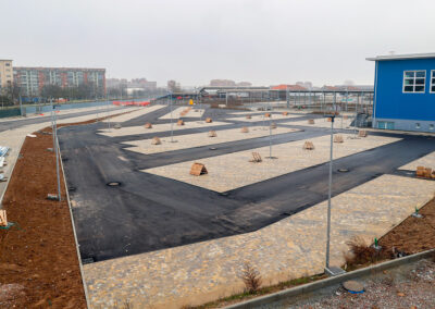 Sistemazioni esterne, passerella: sono in fase di realizzazione : il completamento del montaggio della passerella , la messa in quota delle viabilità interne , la posa degli autobloccanti nelle zone adibite a parcheggio ed è iniziata la realizzazione della strada comunale con la realizzazione dei neri, dell’impianto di illuminazione e degli autobloccanti per i parcheggi.
