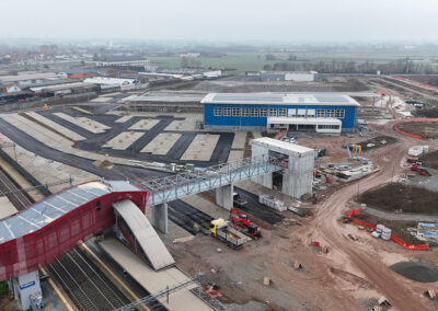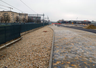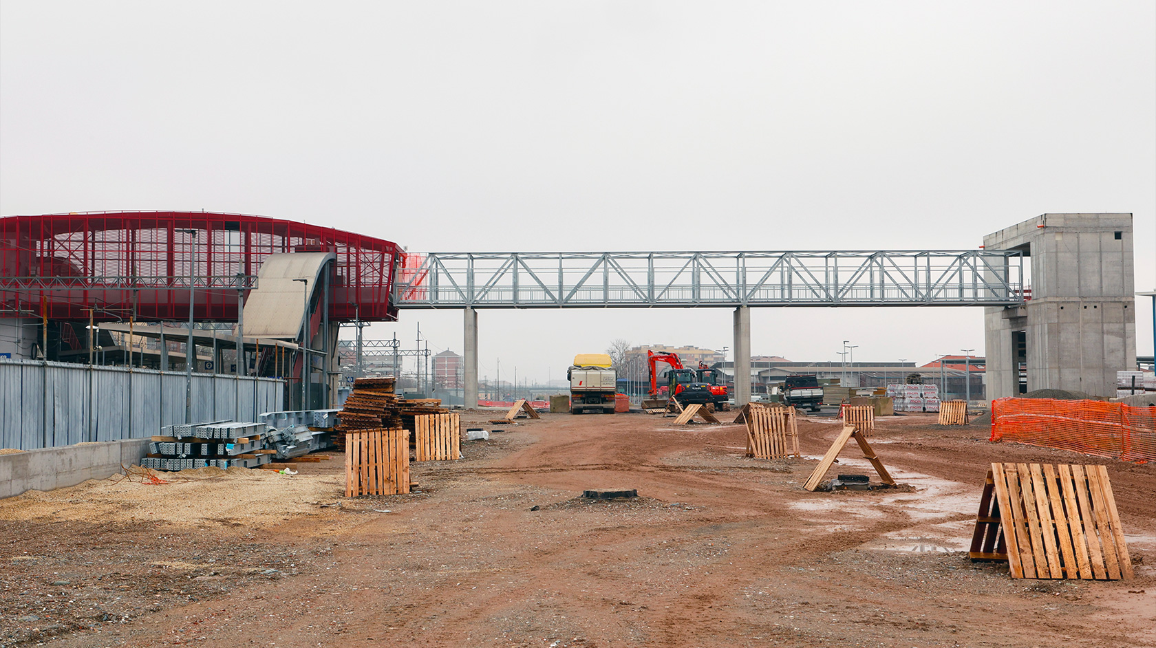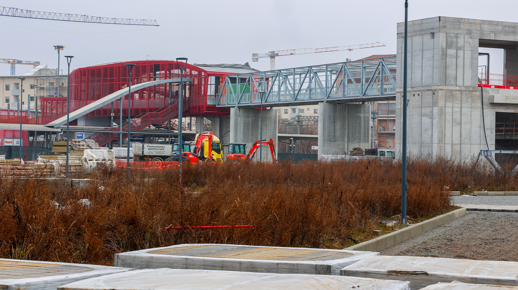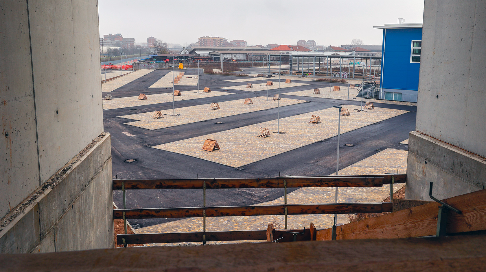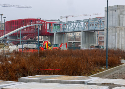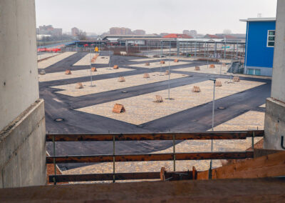 Sistemazioni esterne, passerella: sono in fase di realizzazione : il completamento del montaggio della passerella , la messa in quota delle viabilità interne , la posa degli autobloccanti nelle zone adibite a parcheggio ed è iniziata la realizzazione della strada comunale con la realizzazione dei neri, dell’impianto di illuminazione e degli autobloccanti per i parcheggi.