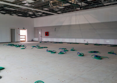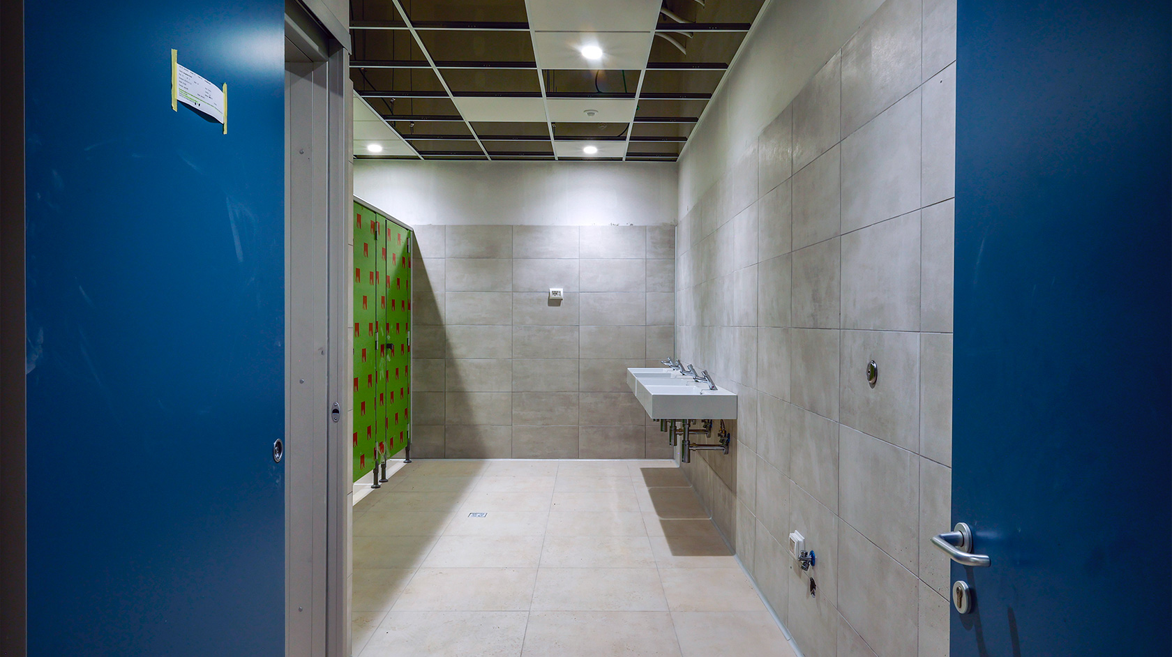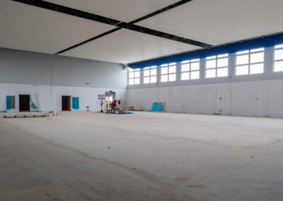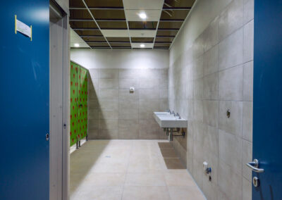 Centro sportivo, locale spogliatoi e pista di atletica:locale spogliatoi e pista di atletica e palestra : sono iniziati i montaggi delle pareti interne in cartongesso e sono iniziati i lavori impiantistici sia elettrici che meccanici , è iniziata la posa dei controsoffitti e dei serramenti interni e delle tende.