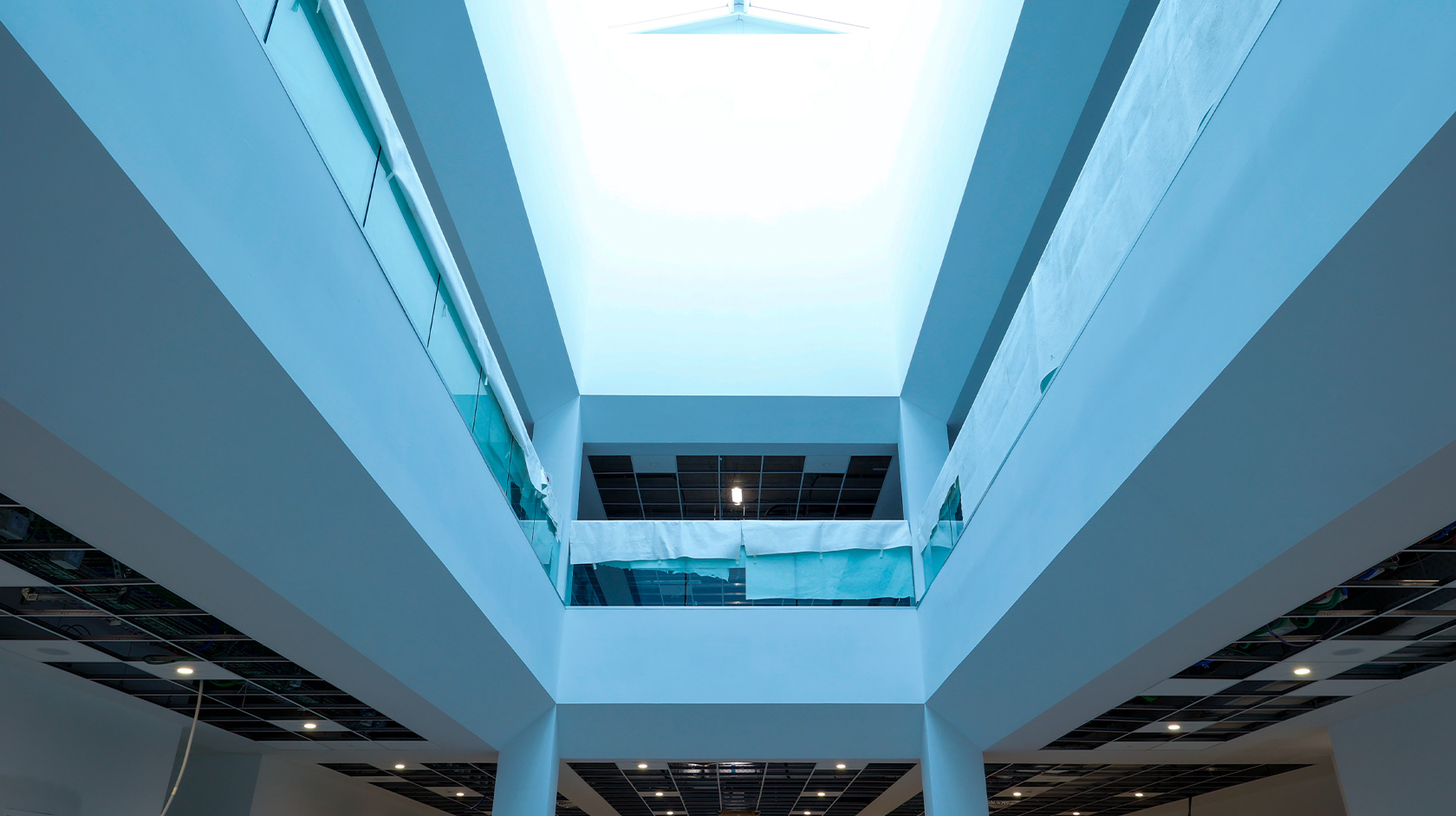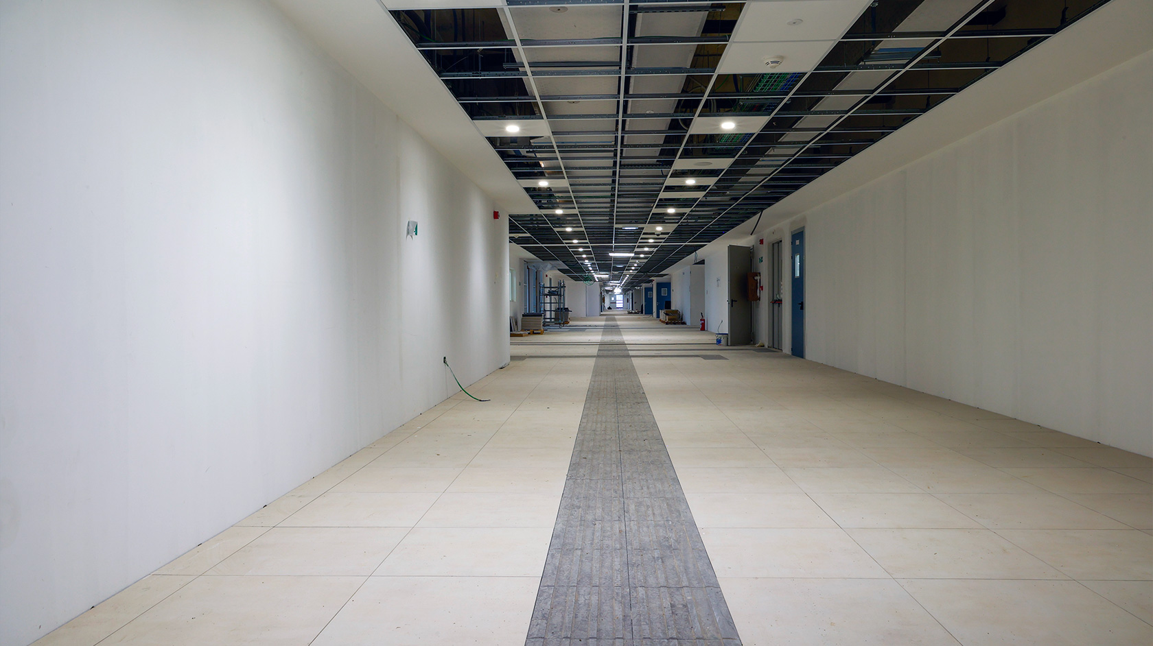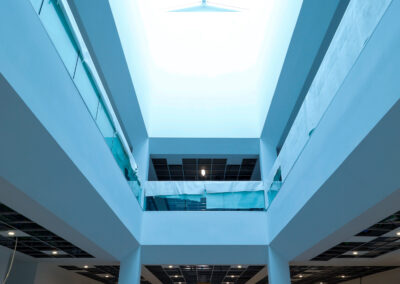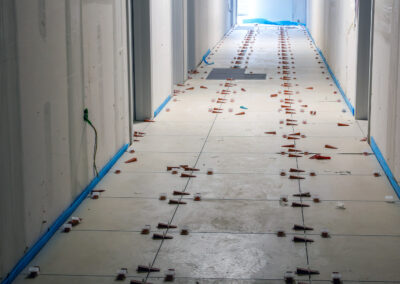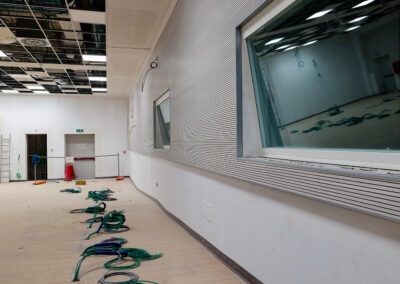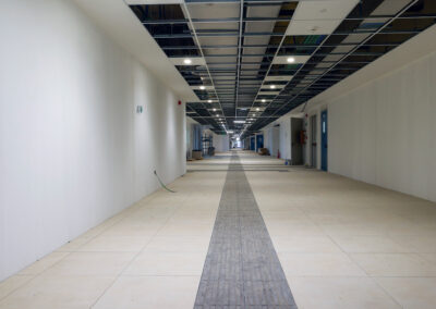 Edificio DA: sono iniziate le tinteggiature interne , sono in fase di sviluppo i lavori impiantistici meccanici ed elettrici a tutti i piani, sono in fase di realizzazione i pavimenti, i rivestimenti dei bagni, l’installazione delle porte e il montaggio di controsoffitti e pareti acustiche.