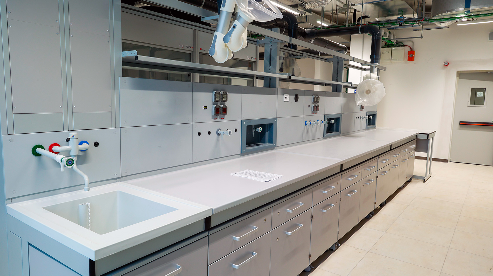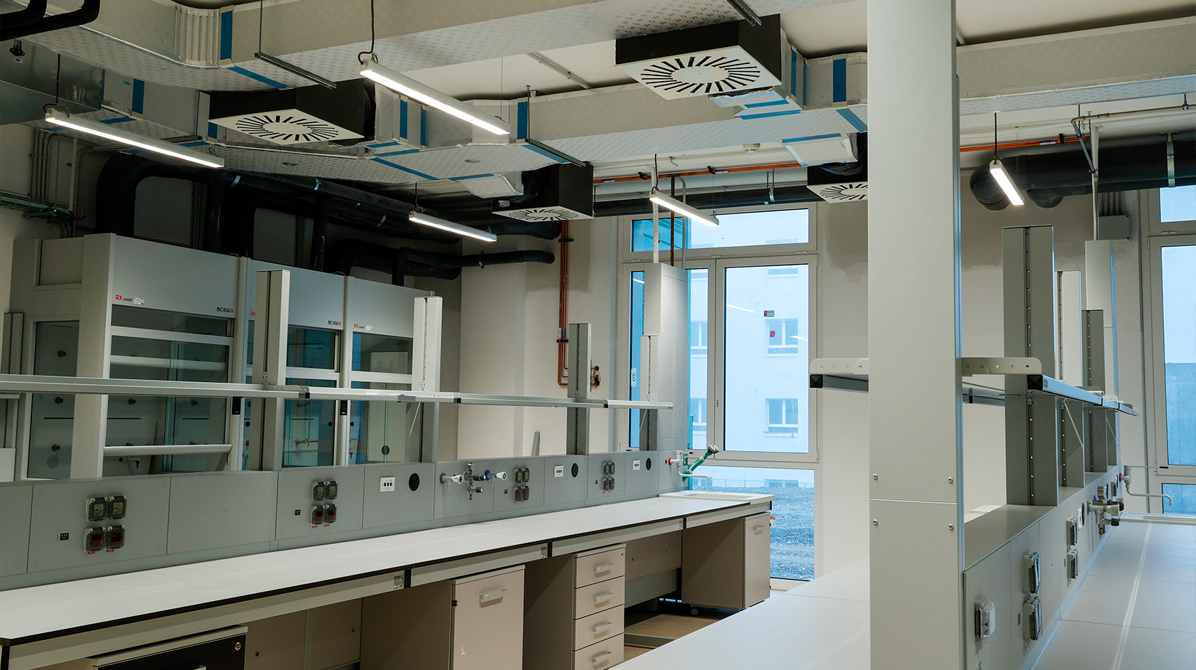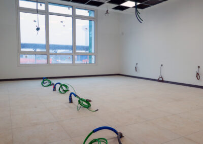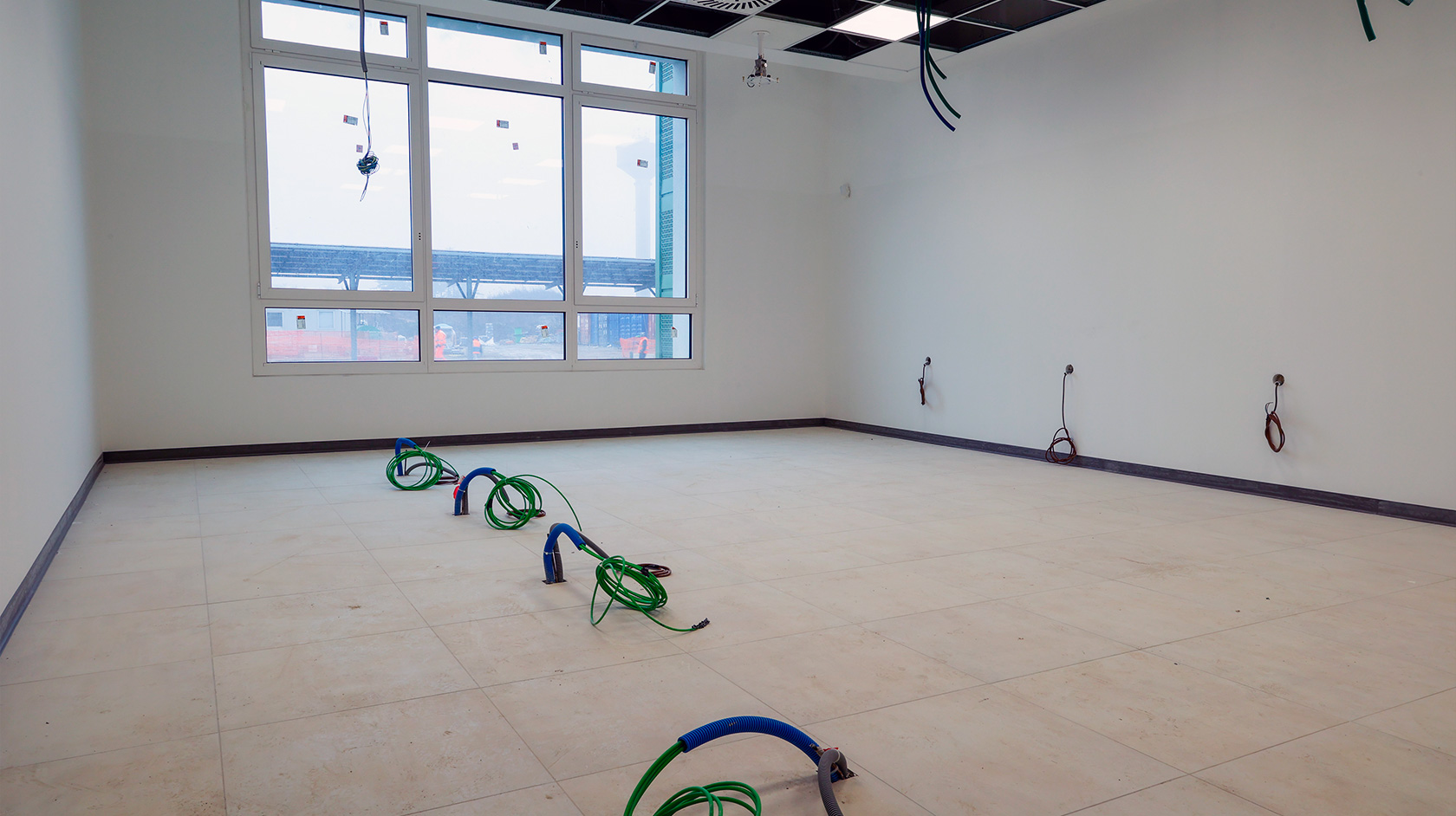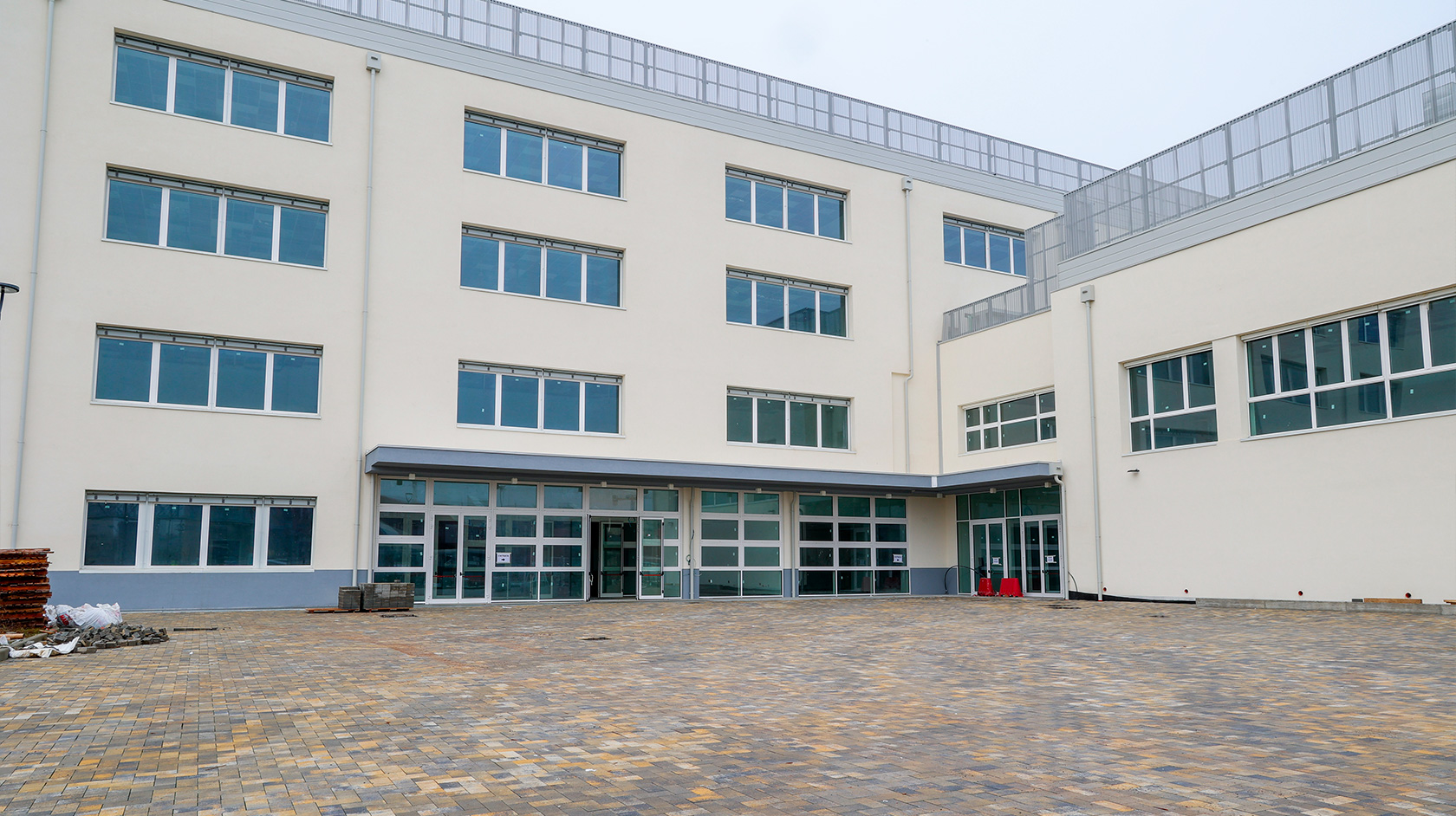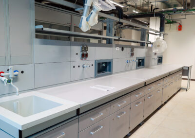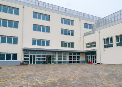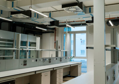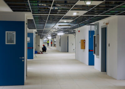 Edificio DR:sono iniziate le tinteggiature interne , sono in fase di sviluppo i lavori impiantistici meccanici ed elettrici a tutti i piani, sono in fase di realizzazione i pavimenti, i rivestimenti dei bagni , l’installazione delle porte e sono in fase di montaggio gli arredi tecnici dei laboratori.