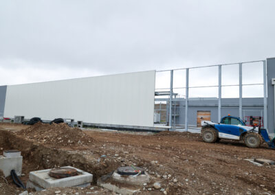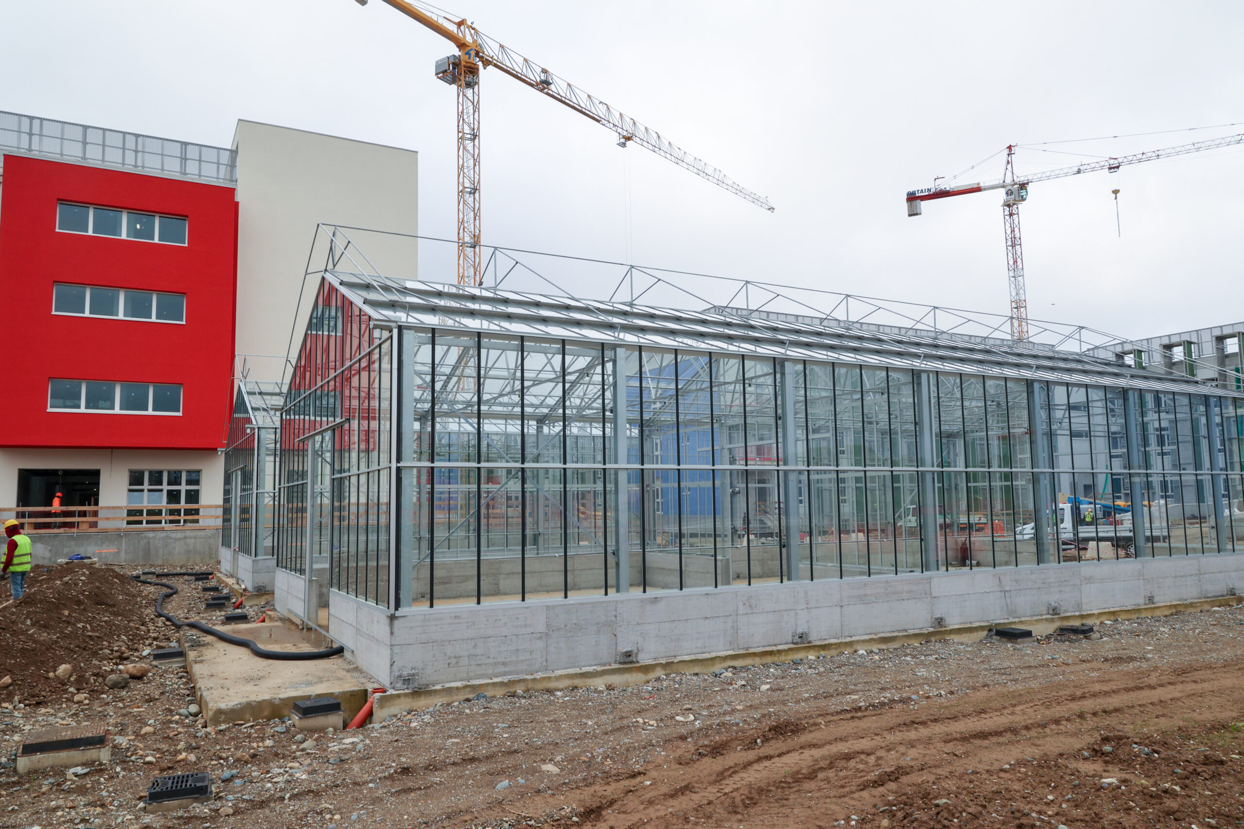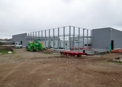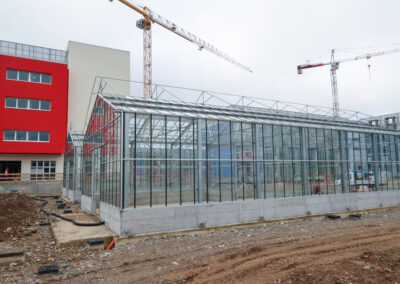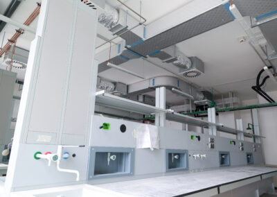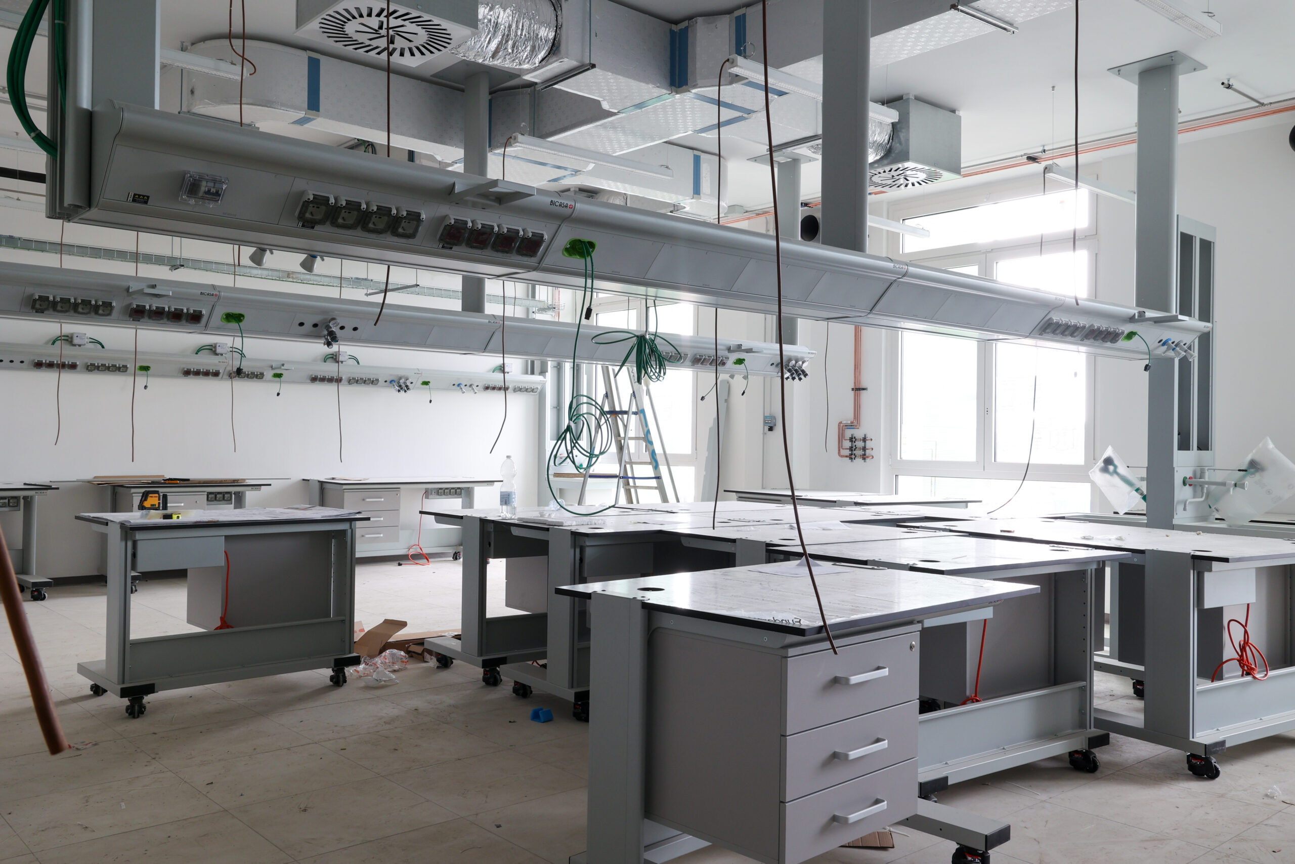 Edificio DR: sono iniziate le tinteggiature esterne, sono in fase di sviluppo i lavori impiantistici meccanici ed elettrici a tutti i piani, sono in fase di realizzazione i pavimenti, i rivestimenti dei bagni, l’installazione delle porte e sono in fase di montaggio gli arredi tecnici dei laboratori.