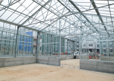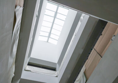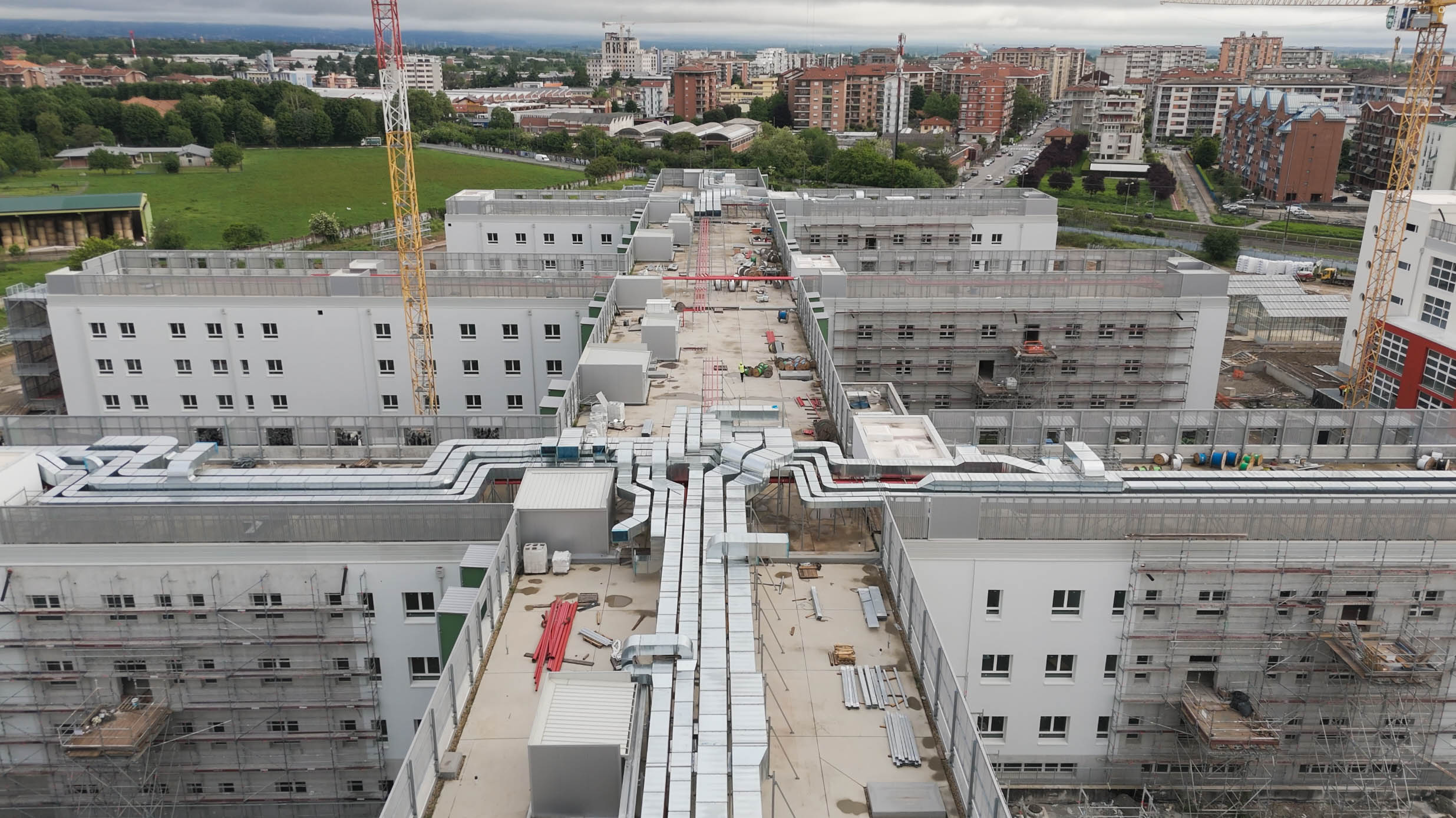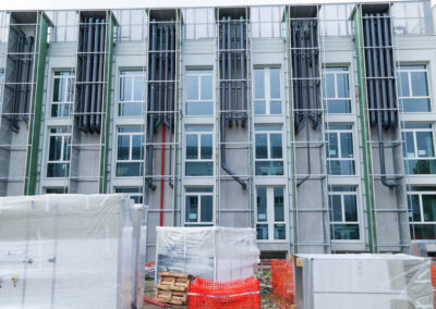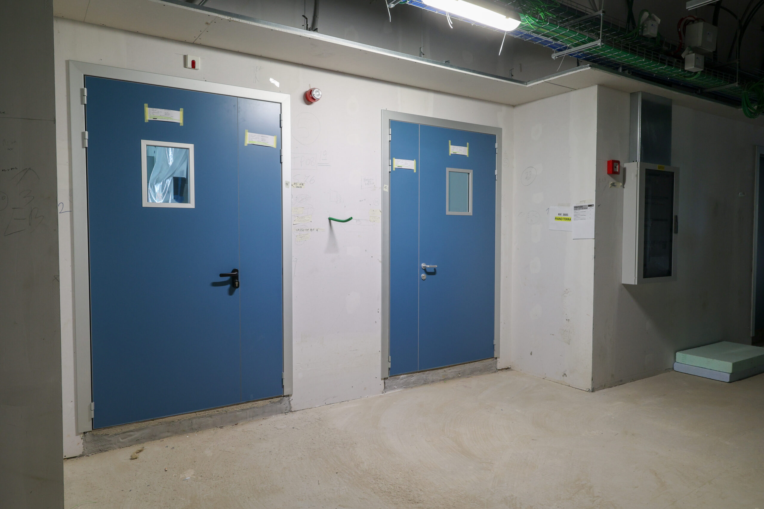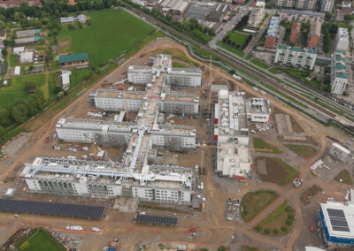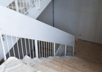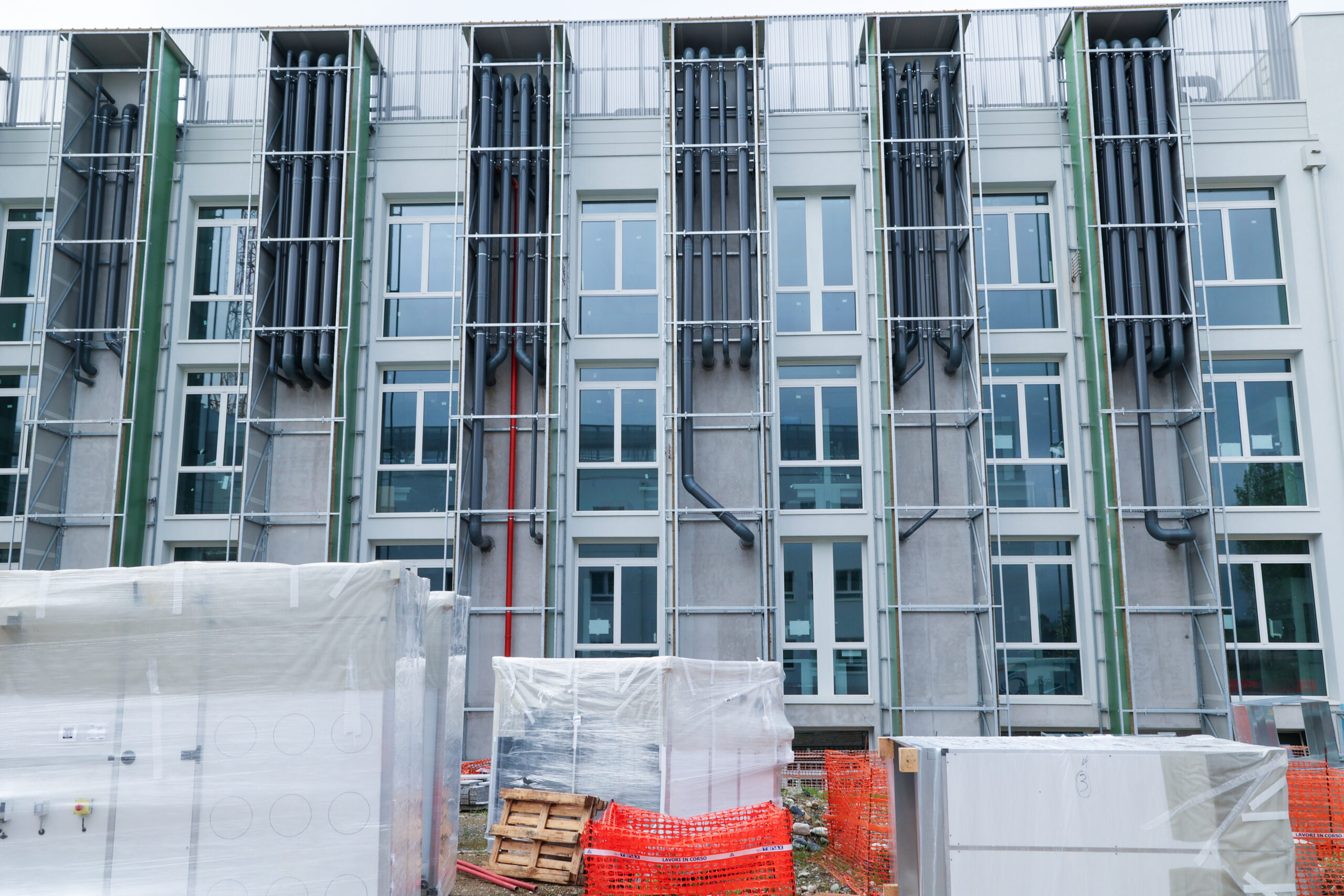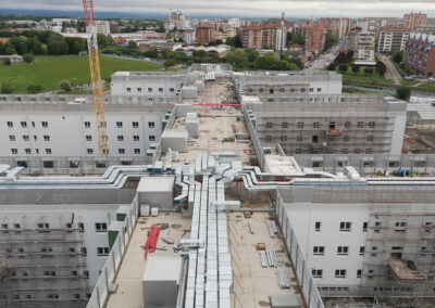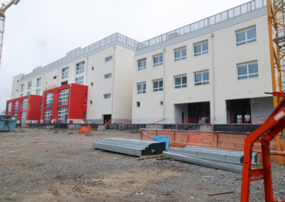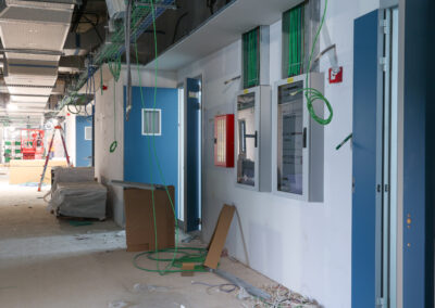 Edificio DA: sono iniziate le tinteggiature esterne, sono in fase di sviluppo i lavori impiantistici meccanici ed elettrici a tutti i piani, sono in fase di realizzazione i pavimenti, i rivestimenti dei bagni, l’installazione delle porte e il montaggio di controsoffitti.