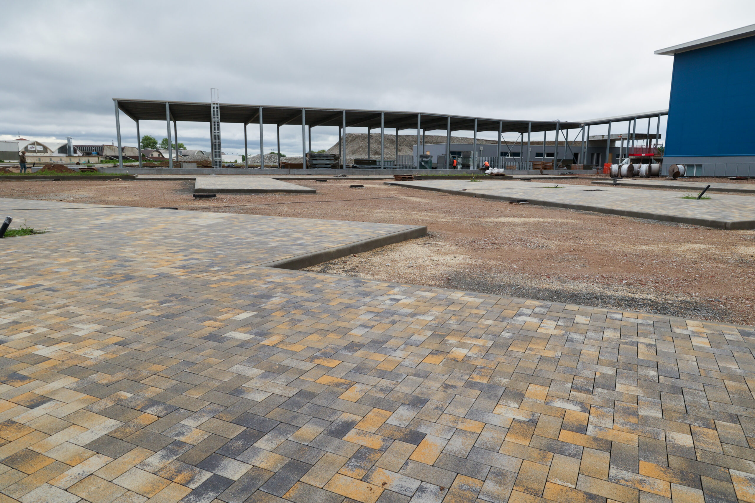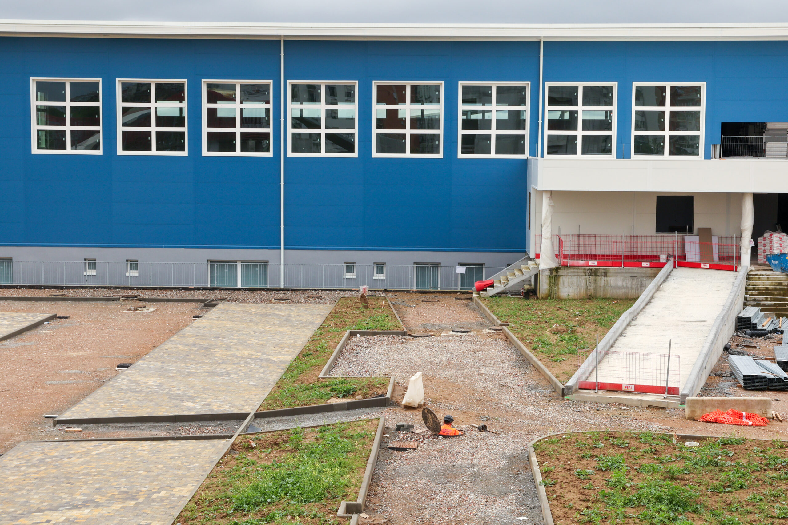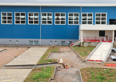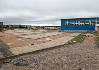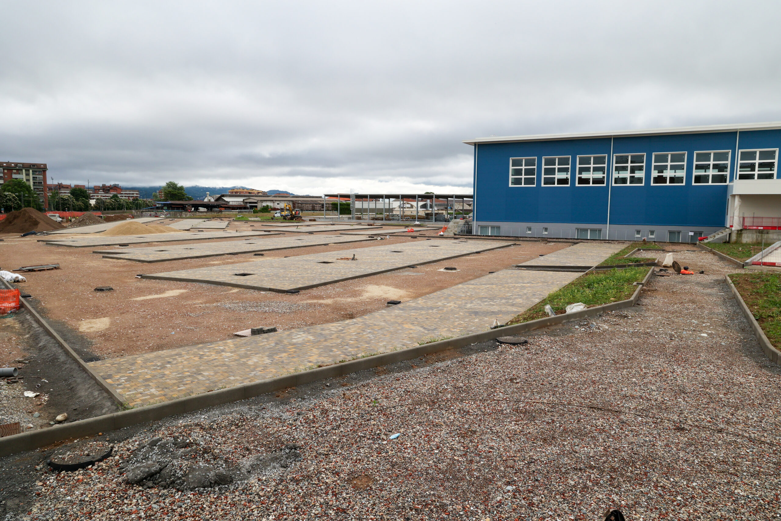 Sistemazioni esterne, passerella: sono in fase di realizzazione il completamento dei sottoservizi e la messa in quota delle viabilità interne ed è iniziata la posa degli autobloccanti nelle zone adibite a parcheggio.