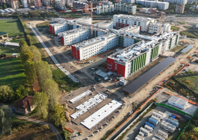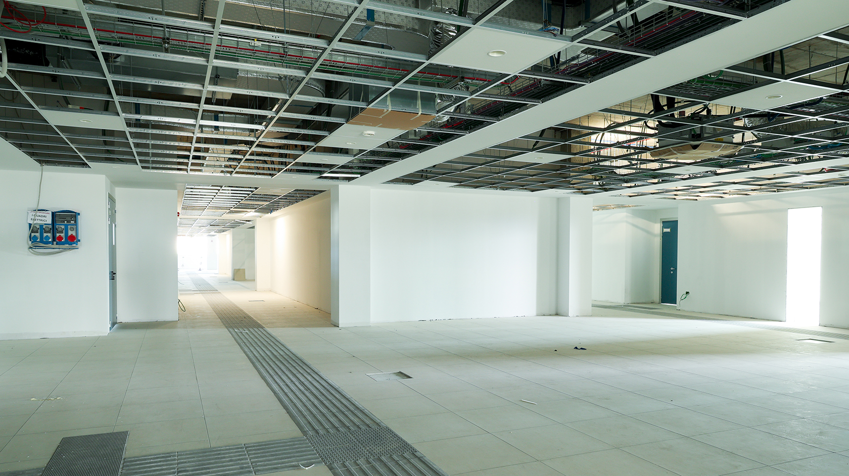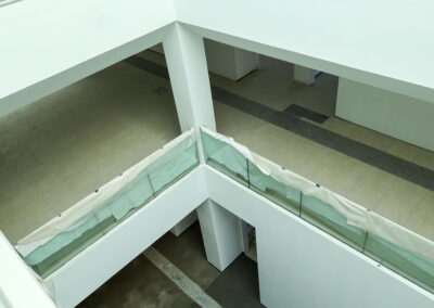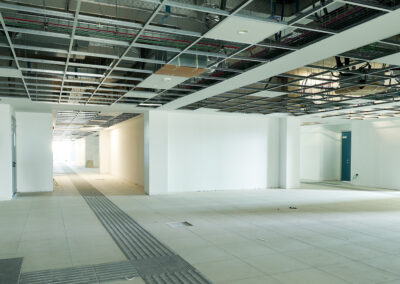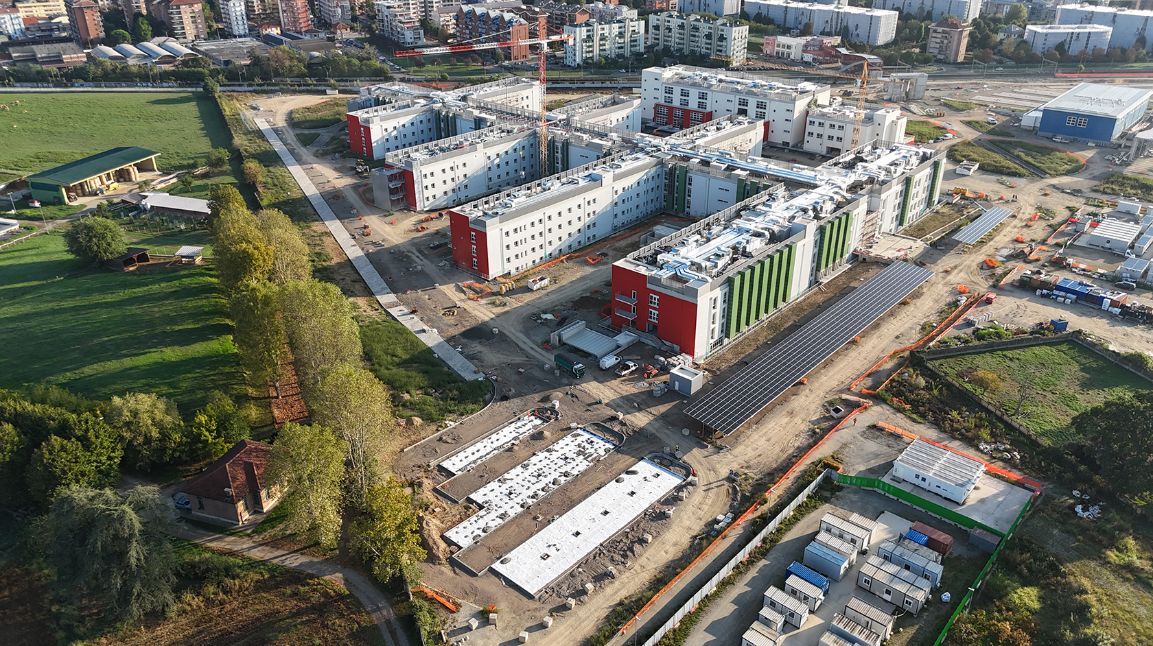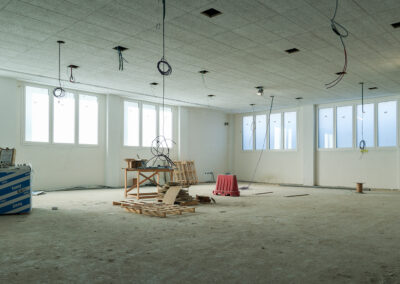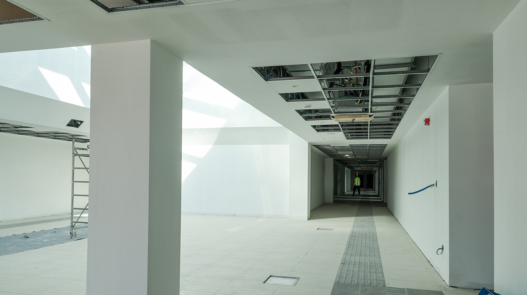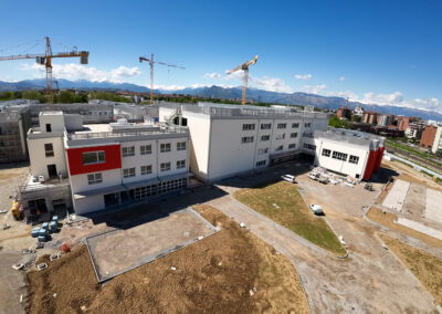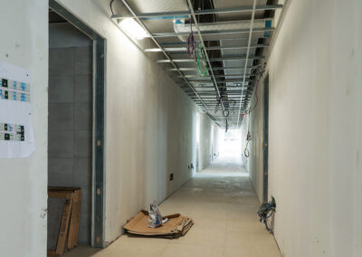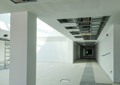 Edificio DA: sono iniziate le tinteggiature interne , sono in fase di sviluppo i lavori impiantistici meccanici ed elettrici a tutti i piani, sono in fase di realizzazione i pavimenti, i rivestimenti dei bagni, l’installazione delle porte e il montaggio di controsoffitti e pareti acustiche.