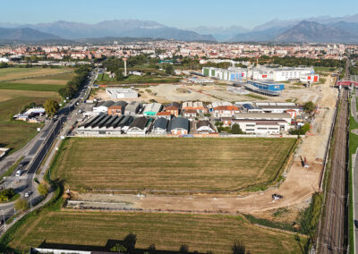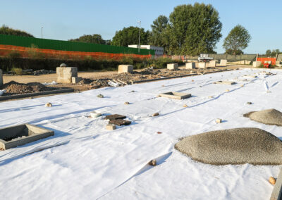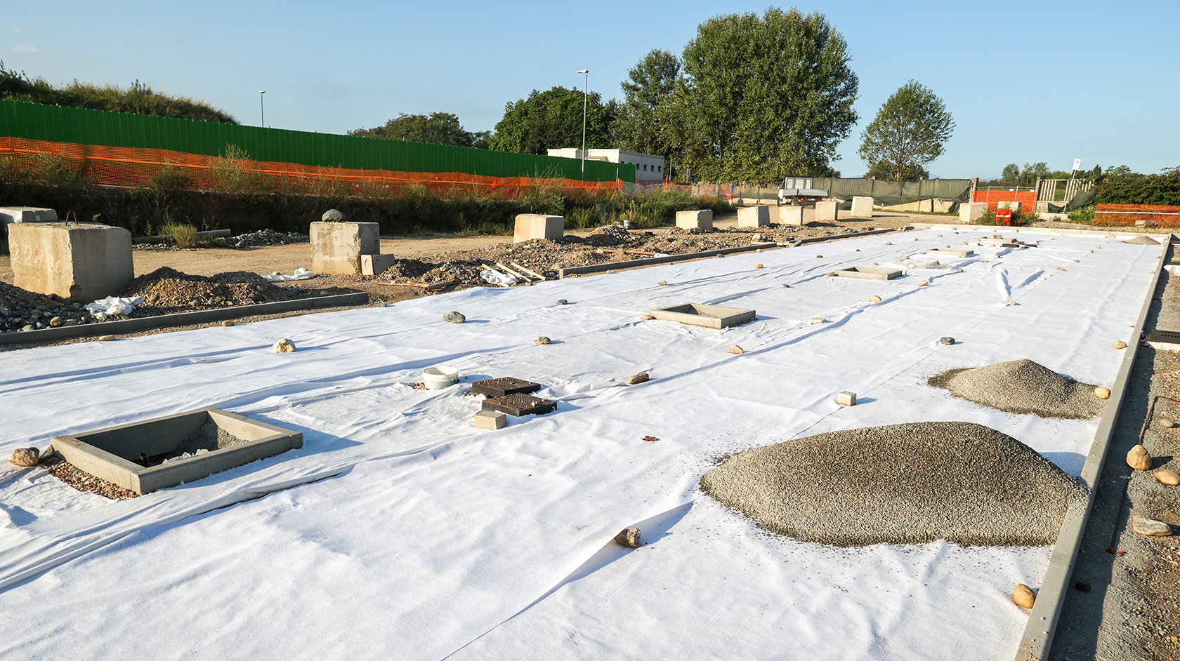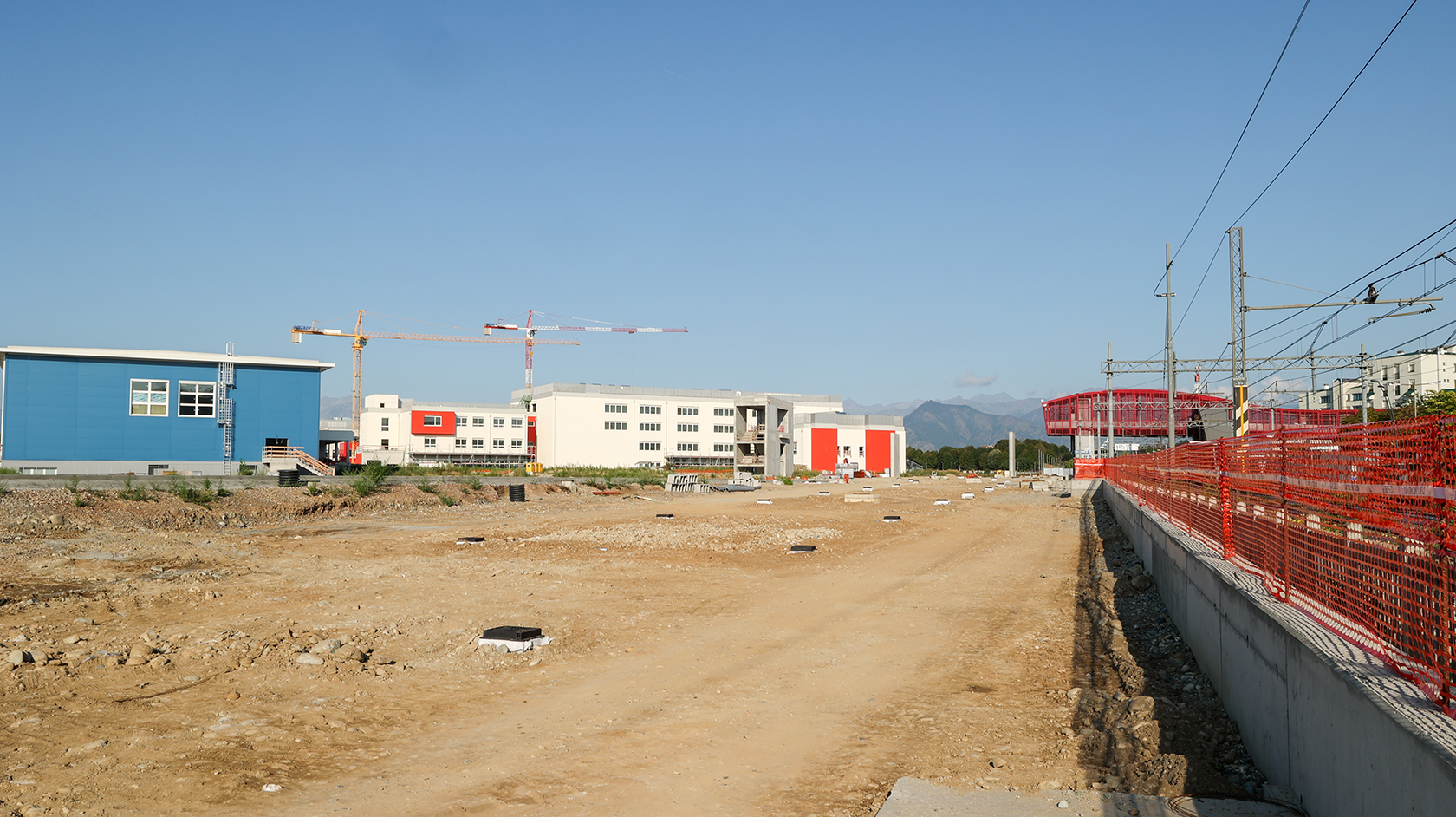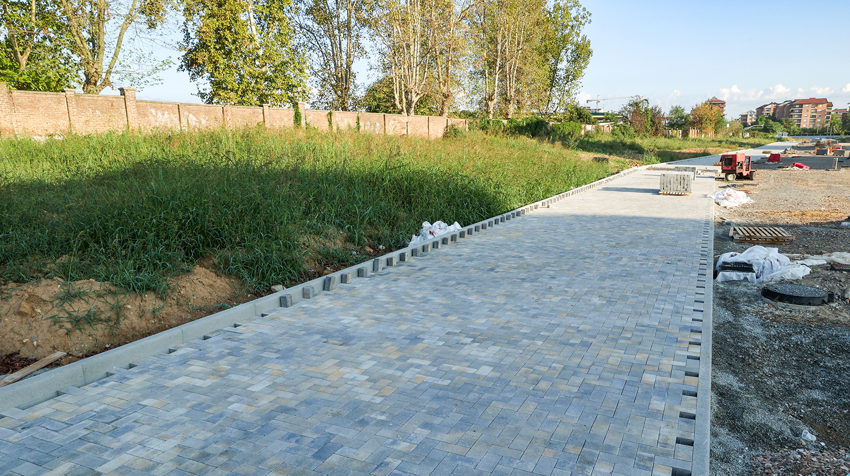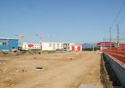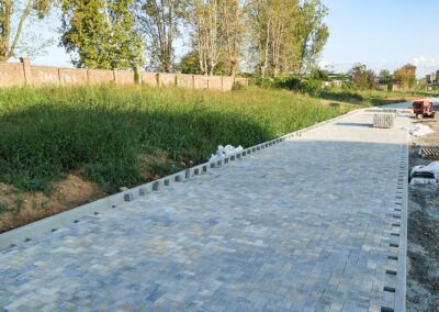 Sistemazioni esterne, passerella: sono in fase di realizzazione il completamento dei sottoservizi e la messa in quota delle viabilità interne ed è iniziata la posa degli autobloccanti nelle zone adibite a parcheggio ed è iniziata la realizzazione della strada comunale.