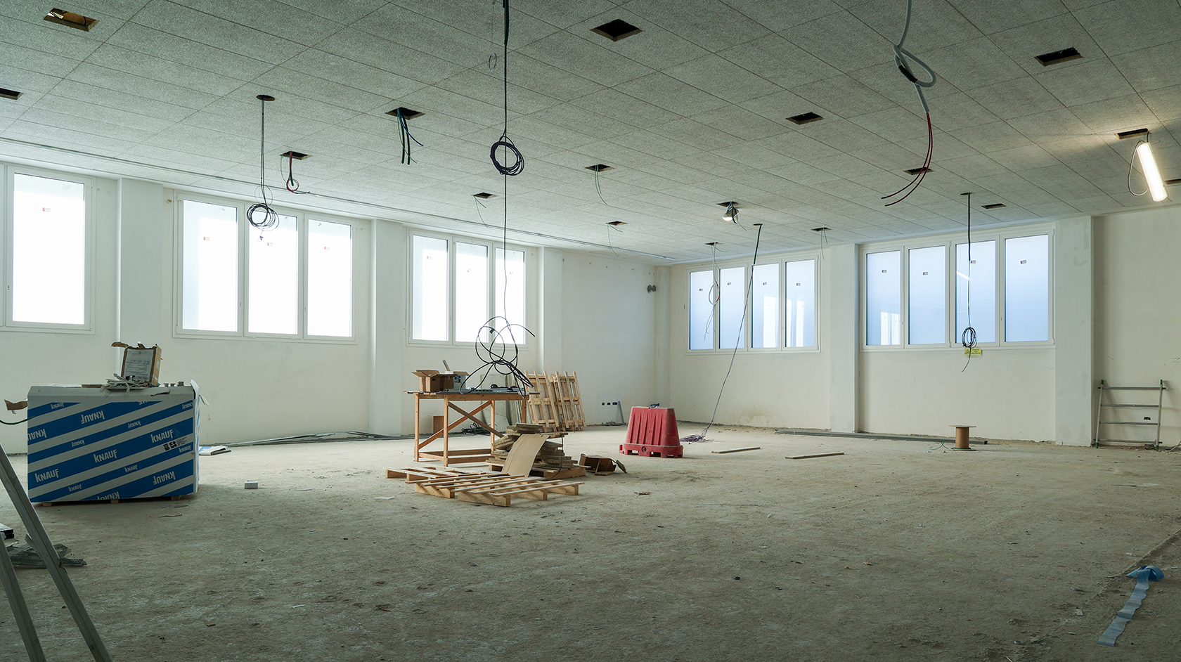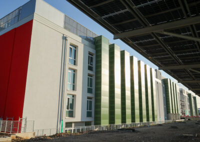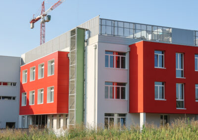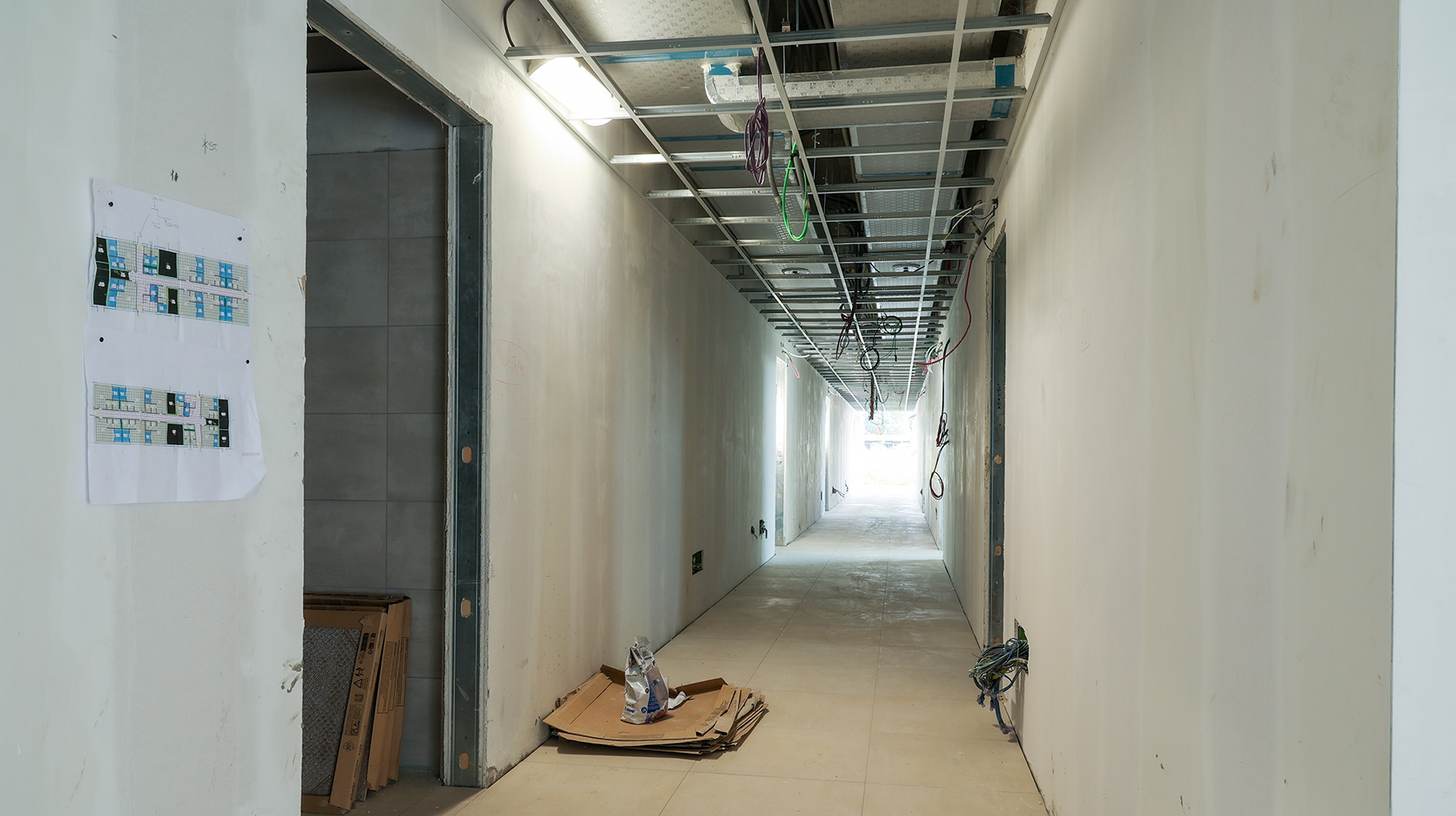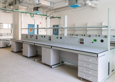 Edificio DR: sono iniziate le tinteggiature interne , sono in fase di sviluppo i lavori impiantistici meccanici ed elettrici a tutti i piani,  sono in fase di realizzazione i pavimenti, i rivestimenti dei bagni , l’installazione delle porte e sono in fase di montaggio gli arredi tecnici dei laboratori.